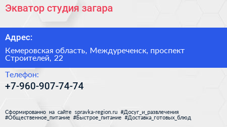 Экватор, студия загара по адресу Кемеровская область, Междуреченск, проспект Строителей, 22 в дальнейшем Организация, размещена в следующих категориях: