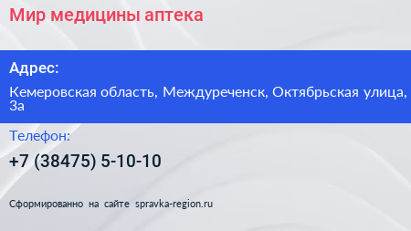 Мир медицины, аптека по адресу Кемеровская область, Междуреченск, Октябрьская улица, 3а в дальнейшем Организация, размещена в следующих категориях: