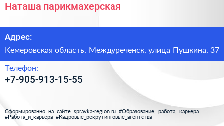 Наташа, парикмахерская по адресу Кемеровская область, Междуреченск, улица Пушкина, 37 в дальнейшем Организация, размещена в следующих категориях: