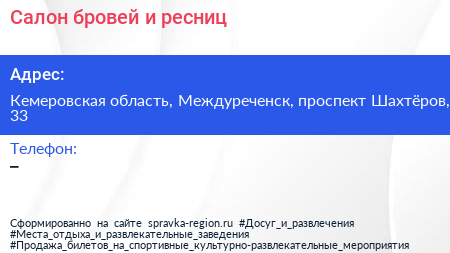Салон бровей и ресниц по адресу Кемеровская область, Междуреченск, проспект Шахтёров, 33 в дальнейшем Организация, размещена в следующих категориях:
