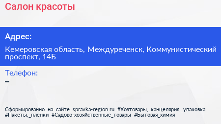 Салон красоты по адресу Кемеровская область, Междуреченск, Коммунистический проспект, 14Б в дальнейшем Организация, размещена в следующих категориях: