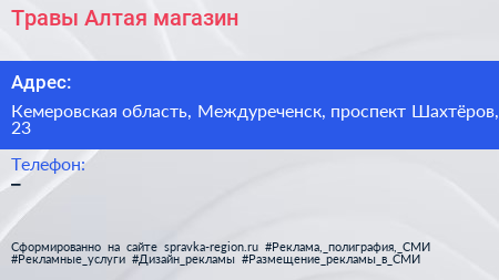 Травы Алтая, магазин по адресу Кемеровская область, Междуреченск, проспект Шахтёров, 23 в дальнейшем Организация, размещена в следующих категориях: