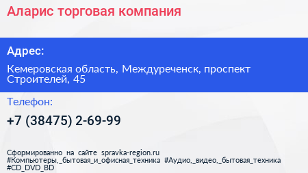 Аларис, торговая компания по адресу Кемеровская область, Междуреченск, проспект Строителей, 45 в дальнейшем Организация, размещена в следующих категориях: