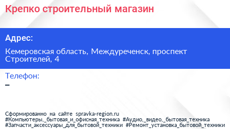 Крепко!, строительный магазин по адресу Кемеровская область, Междуреченск, проспект Строителей, 4 в дальнейшем Организация, размещена в следующих категориях: