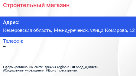 Строительный магазин по адресу Кемеровская область, Междуреченск, улица Комарова, 12 в дальнейшем Организация, размещена в следующих категориях:
