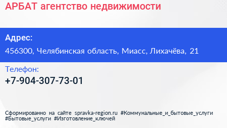 АРБАТ, агентство недвижимости по адресу 456300, Челябинская область, Миасс, Лихачёва, 21 в дальнейшем Организация, размещена в следующих категориях: