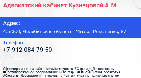 Адвокатский кабинет Кузнецовой А.М. по адресу 456300, Челябинская область, Миасс, Романенко, 87 в дальнейшем Организация, размещена в следующих категориях: