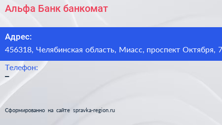 Альфа-Банк, банкомат по адресу 456318, Челябинская область, Миасс, проспект Октября, 7 в дальнейшем Организация, размещена в следующих категориях: