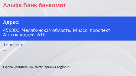 Альфа-Банк, банкомат по адресу 456300, Челябинская область, Миасс, проспект Автозаводцев, 61Б в дальнейшем Организация, размещена в следующих категориях: