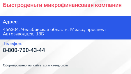 Быстроденьги, микрофинансовая компания по адресу 456304, Челябинская область, Миасс, проспект Автозаводцев, 18Б в дальнейшем Организация, размещена в следующих категориях: