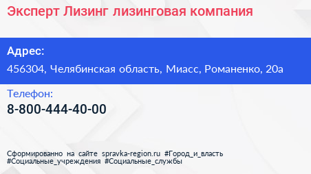 Эксперт-Лизинг, лизинговая компания по адресу 456304, Челябинская область, Миасс, Романенко, 20а в дальнейшем Организация, размещена в следующих категориях: