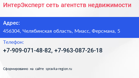ИнтерЭксперт, сеть агентств недвижимости по адресу 456304, Челябинская область, Миасс, Ферсмана, 5 в дальнейшем Организация, размещена в следующих категориях: