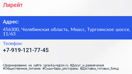 Лирейт по адресу 456300, Челябинская область, Миасс, Тургоякское шоссе, 11/63 в дальнейшем Организация, размещена в следующих категориях:
