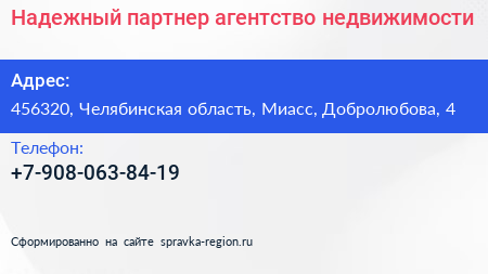 Надежный партнер, агентство недвижимости по адресу 456320, Челябинская область, Миасс, Добролюбова, 4 в дальнейшем Организация, размещена в следующих категориях: