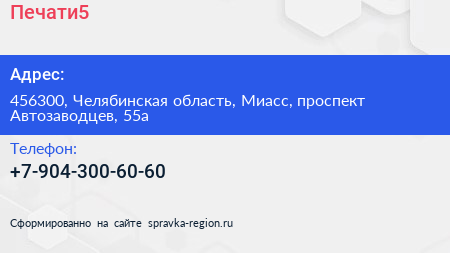 Печати5 по адресу 456300, Челябинская область, Миасс, проспект Автозаводцев, 55а в дальнейшем Организация, размещена в следующих категориях: