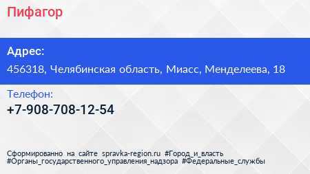 Пифагор по адресу 456318, Челябинская область, Миасс, Менделеева, 18 в дальнейшем Организация, размещена в следующих категориях: