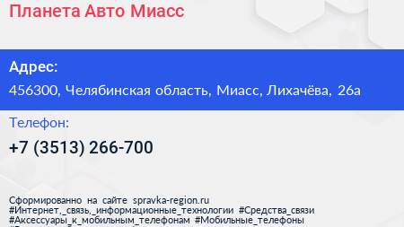 Планета Авто Миасс по адресу 456300, Челябинская область, Миасс, Лихачёва, 26а в дальнейшем Организация, размещена в следующих категориях: