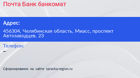 Почта Банк, банкомат по адресу 456304, Челябинская область, Миасс, проспект Автозаводцев, 23 в дальнейшем Организация, размещена в следующих категориях: