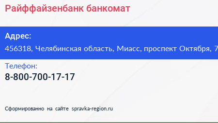 Райффайзенбанк, банкомат по адресу 456318, Челябинская область, Миасс, проспект Октября, 7 в дальнейшем Организация, размещена в следующих категориях:
