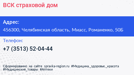 ВСК, страховой дом по адресу 456300, Челябинская область, Миасс, Романенко, 50Б в дальнейшем Организация, размещена в следующих категориях: