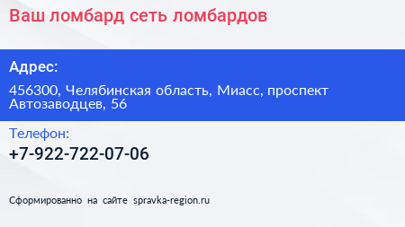 Ваш ломбард, сеть ломбардов по адресу 456300, Челябинская область, Миасс, проспект Автозаводцев, 56 в дальнейшем Организация, размещена в следующих категориях: