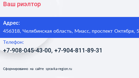 Ваш риэлтор по адресу 456318, Челябинская область, Миасс, проспект Октября, 5 в дальнейшем Организация, размещена в следующих категориях: