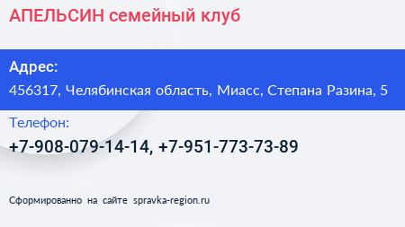 АПЕЛЬСИН, семейный клуб по адресу 456317, Челябинская область, Миасс, Степана Разина, 5 в дальнейшем Организация, размещена в следующих категориях: