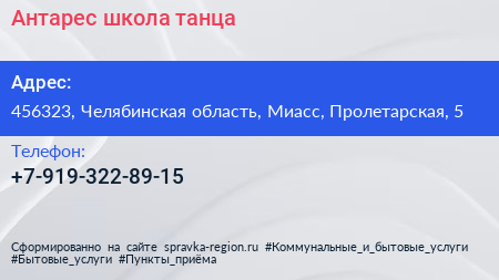 Антарес, школа танца по адресу 456323, Челябинская область, Миасс, Пролетарская, 5 в дальнейшем Организация, размещена в следующих категориях:
