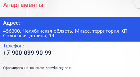 Апартаменты по адресу 456300, Челябинская область, Миасс, территория КП Солнечная долина, 14 в дальнейшем Организация, размещена в следующих категориях: