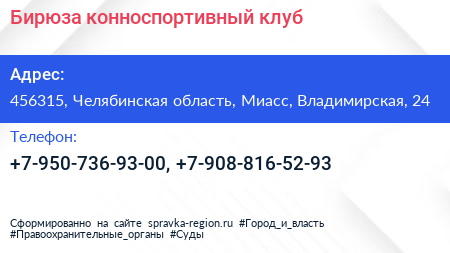 Бирюза, конноспортивный клуб по адресу 456315, Челябинская область, Миасс, Владимирская, 24 в дальнейшем Организация, размещена в следующих категориях: