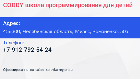 CODDY, школа программирования для детей по адресу 456300, Челябинская область, Миасс, Романенко, 50а в дальнейшем Организация, размещена в следующих категориях: