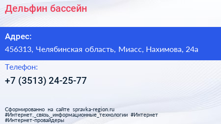 Дельфин, бассейн по адресу 456313, Челябинская область, Миасс, Нахимова, 24а в дальнейшем Организация, размещена в следующих категориях: