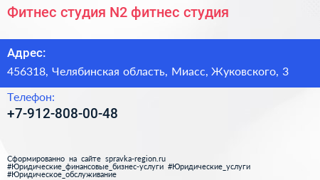 Фитнес студия N2, фитнес-студия по адресу 456318, Челябинская область, Миасс, Жуковского, 3 в дальнейшем Организация, размещена в следующих категориях: