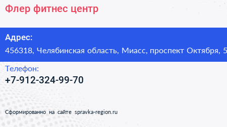 Флер, фитнес-центр по адресу 456318, Челябинская область, Миасс, проспект Октября, 5 в дальнейшем Организация, размещена в следующих категориях:
