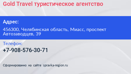 Gold Travel, туристическое агентство по адресу 456300, Челябинская область, Миасс, проспект Автозаводцев, 39 в дальнейшем Организация, размещена в следующих категориях: