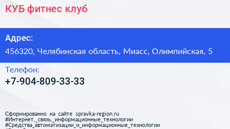 КУБ, фитнес-клуб по адресу 456320, Челябинская область, Миасс, Олимпийская, 5 в дальнейшем Организация, размещена в следующих категориях: