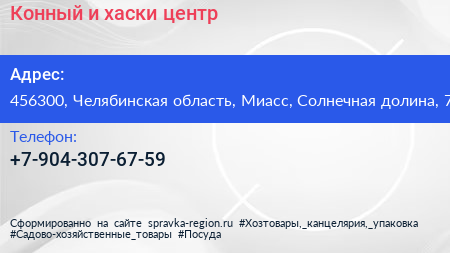 Конный и хаски-центр по адресу 456300, Челябинская область, Миасс, Солнечная долина, 7 в дальнейшем Организация, размещена в следующих категориях: