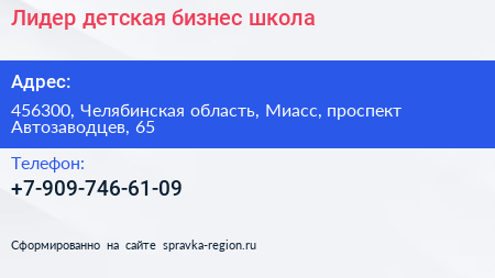 Лидер, детская бизнес-школа по адресу 456300, Челябинская область, Миасс, проспект Автозаводцев, 65 в дальнейшем Организация, размещена в следующих категориях: