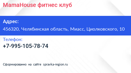 MamaHouse, фитнес-клуб по адресу 456320, Челябинская область, Миасс, Циолковского, 10 в дальнейшем Организация, размещена в следующих категориях: