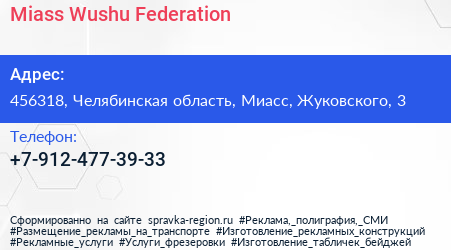 Miass Wushu Federation по адресу 456318, Челябинская область, Миасс, Жуковского, 3 в дальнейшем Организация, размещена в следующих категориях: