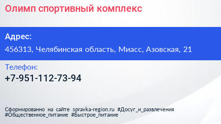 Олимп, спортивный комплекс по адресу 456313, Челябинская область, Миасс, Азовская, 21 в дальнейшем Организация, размещена в следующих категориях:
