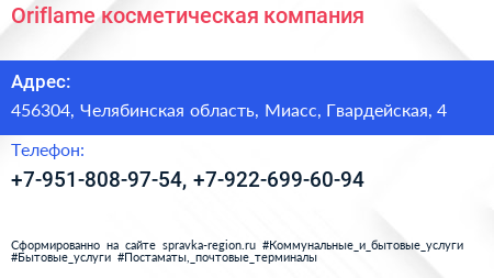 Oriflame, косметическая компания по адресу 456304, Челябинская область, Миасс, Гвардейская, 4 в дальнейшем Организация, размещена в следующих категориях: