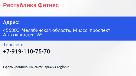 Республика Фитнес по адресу 456300, Челябинская область, Миасс, проспект Автозаводцев, 65 в дальнейшем Организация, размещена в следующих категориях: