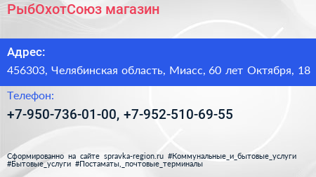 РыбОхотСоюз, магазин по адресу 456303, Челябинская область, Миасс, 60 лет Октября, 18 в дальнейшем Организация, размещена в следующих категориях: