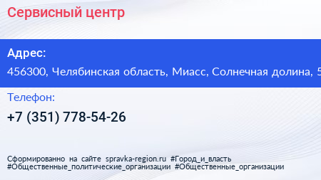 Сервисный центр по адресу 456300, Челябинская область, Миасс, Солнечная долина, 5 в дальнейшем Организация, размещена в следующих категориях: