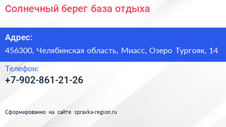 Солнечный берег, база отдыха по адресу 456300, Челябинская область, Миасс, Озеро Тургояк, 14 в дальнейшем Организация, размещена в следующих категориях: