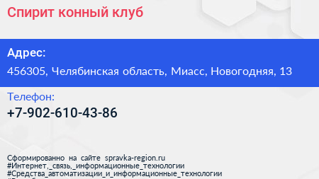 Спирит, конный клуб по адресу 456305, Челябинская область, Миасс, Новогодняя, 13 в дальнейшем Организация, размещена в следующих категориях: