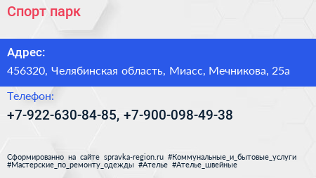 Спорт-парк по адресу 456320, Челябинская область, Миасс, Мечникова, 25а в дальнейшем Организация, размещена в следующих категориях: