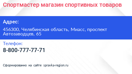 Спортмастер, магазин спортивных товаров по адресу 456300, Челябинская область, Миасс, проспект Автозаводцев, 65 в дальнейшем Организация, размещена в следующих категориях: