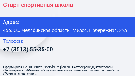 Старт, спортивная школа по адресу 456300, Челябинская область, Миасс, Набережная, 29а в дальнейшем Организация, размещена в следующих категориях: